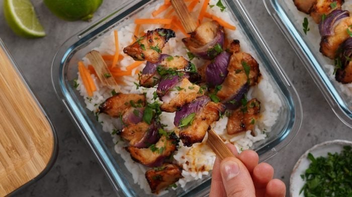 - Podawaj szaszłyki z porcją ugotowanego ryżu basmati i warzywami, które wybrałeś. Flo zaleca marchewkę i ogórka jako zdrową przygryzkę.