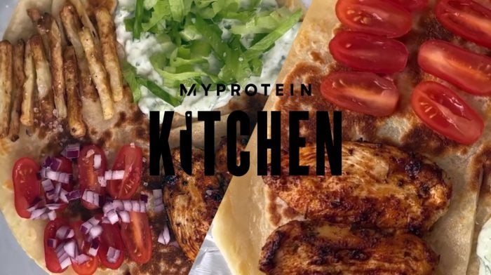 - Rozgrzej swój chlebek lub wrapa i umieść go na talerzu. Zrób nacięcie w połowie wrapa, a następnie ułóż nadzienie w każdej ćwiartce: jedna ćwiartka z pokrojonym kurczakiem, jedna z sałatą, jedna z tzatziki i jedna z frytkami.
