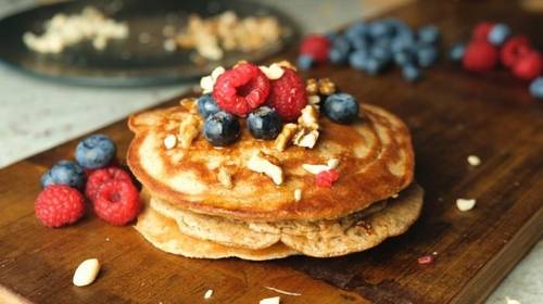 - Ułóż naleśniki jeden na drugim i udekoruj ulubionymi dodatkami - zalecamy garść jagód, posiekane orzechy i odrobinę syropu bezcukrowego