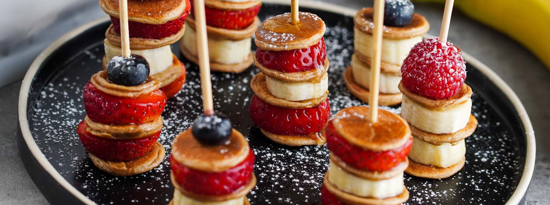 - Zbuduj koreczki, układając na przemian naleśniki i owoce.