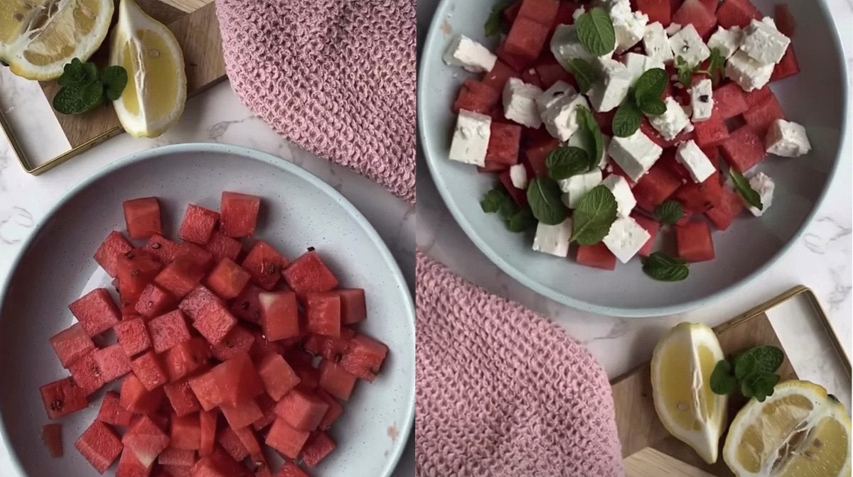- Najpierw dodaj pokrojonego w kostkę arbuza i fetę do dużej miski i delikatnie wymieszaj, aby połączyć.