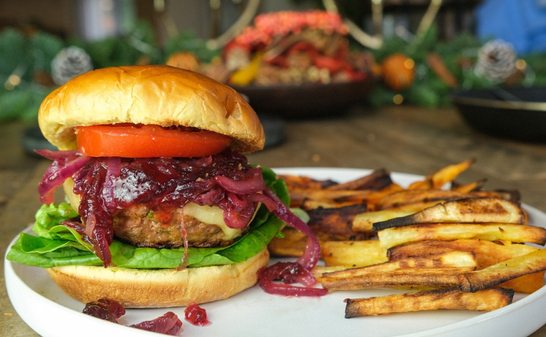 I w końcu możesz stworzyć swojego pysznego burgera! Zacznij od bułki, następnie dodaj sałatę, mięso, sos i na koniec plasterek pomidora. Świąteczny Burger z Indykiem i Żurawiną