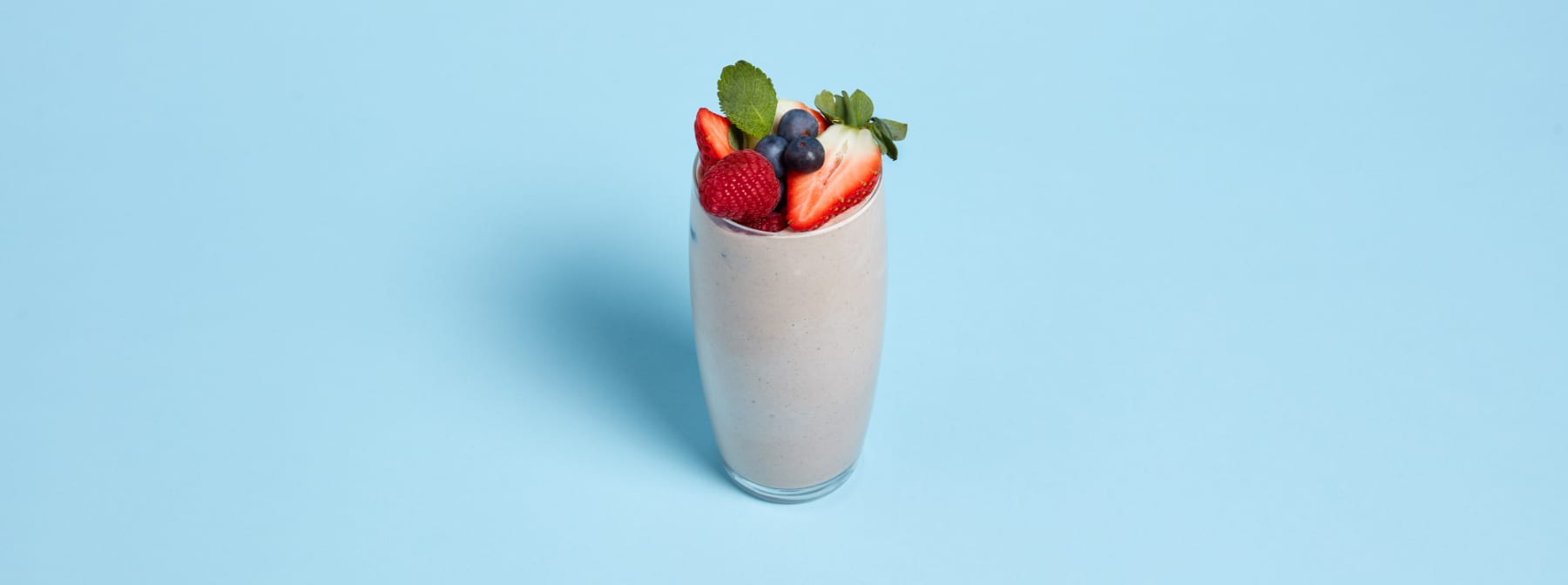 Wsyp Wegańską mieszankę białkową, mleko migdałowe, banana i lód do blendera i mieszaj do uzyskania gładkiej konsystencji Wlej do szklanki i ozdób ulubionymi dodatkami - my uwielbiamy zblendowane jagody — smacznego!