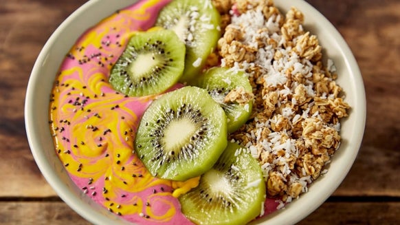 Miseczka pysznego smoothie z mango i pitai z dodatkiem płynnej Omega.