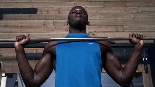 - Bez kołysania ciałem lub kopania nogami, wypchnij hantle z powrotem do pozycji wyjściowej, ponownie prostując łokcie u góry przed rozpoczęciem kolejnych powtórzeń.